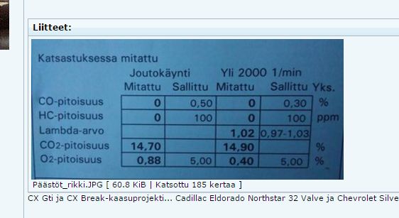 Croisette kirjoitti: Jälleen kerran ilahdutti, että tuon mun 325 tkm ajetun Xantian, jossa lienee alkuperäinen kattikin, päästöt on liki nollatasoa, ja ilman edes kunnollista katin lämpimäksi ajamista  .  Tuollaiset CO 0.01/0.02 ja HC 6 arvot ei ole kovinkaan yleisiä, edes paljon vähemmän ajetuissa, ja oikeesti kunnolla katti kuumaksi ajettuna tuossa oli viimevuonna vielä pienemmät luvut  . (öljyn lämpötilan mitta-anturi ei ollut kiinni, jos joku sitä ihmettelee) ! Tosiaan sori nyt että Croisette oli oikeassa, tässä 15-vuotiaan Vortec V8:n tulos, paljon parempi ja ei edes ihan käyntilämpöinen.