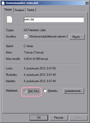 laakeri kirjoitti: Harri126 kirjoitti: Annapa joku hyvä neuvo, miten se tehdään.  Aika monta kertaa koitettu jo, ehkä en vaan osaa.  Kai myö nyt windows-ympäristössä ollaan? Liitteet: esim.jpg Ihan vaikka näin. Liitteet: esim2.jpg Tai vaikka tuostakin. Normaalikielisissä wintööteissä lukee tuossa kohdassa muistaakseni "Read only". Miulla on tämmöinen koneen mukana tullut hankalampi versio, enkä ole jaksanutviitsinytvälittänyt vaihtaa... Juu, toi täppi ton poistettu monta kertaa, mutta se ei oikeasti poistukaan vaan on siinä, kun avaa ominaisuudet uudestaan. Ylemmästä en sitten ymmärtänytkään mitään.