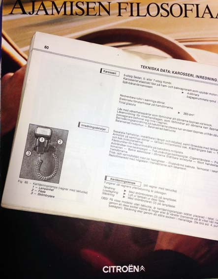 Mulla on parissa cx:ssä alkuperäisen oloinen aikansa navigointilaite, eli repsikan karttavalo joutsenkaulalla. Made in France.