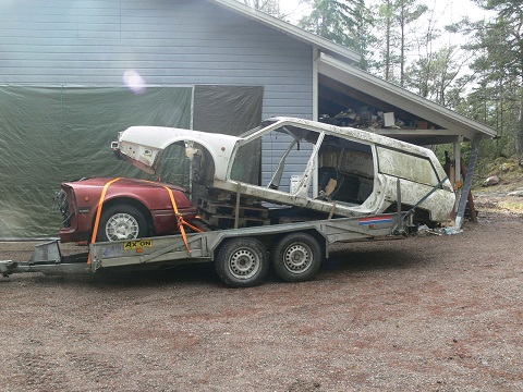 Saabin moottori mahtuu hyvin AX:ään, jopa pystyssä. Eikä tavaratilan verhoilu rajoita sidontaliinojen kiinnitystä. Lähes 20 vuotta sitten AX:llä kulki myös 7-litrainen Fordin isolohko, tosin osiin purettuna, mutta ei se purkamalla kevyemmäksi muutu.