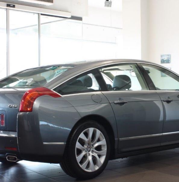 Parinkymmenen kaupunkikilometrin jälkeen putkahdettiin liikkeen pihaan, joka vakuutti siisteydellään. Saumattomien lasiseinien sisällä kiilteli 3000 km ajettu Xf-Jagge, pari tuoretta Aero-saabbia, ja... Citroen C6 3.0 HDI Exclusive RT5 vm.2010, ajettu alle 40.000 km!