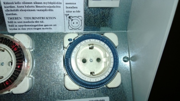 Talon pihassa on tolppapaikka ja siinä Theben-kellolaite, pariksi tunniksi kerrallaan. No, laitetaan lämmitys vaikka välille klo 14-16 välille. Ja piuha autoon. Sitten klo 15.45 tulee asiaa eli autolla menoksi. Paluu lähtöruutuun jossain vaiheessa ja kellon ajastus aamulle klo 04-06. Ja piuha autoon kiinni. Kas kummaa, lämppärin vihellys alkaa, vaikka seuraava lämpö oli tilattu vaikka aamuksi. Että tällainen tapaus.