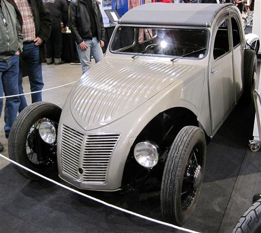 Olli Erkkilä´s fenderles, channeled and chopped rod is imaginative project mixing old ragtop Citroen to early 50's Hot Rods. 2cv production started in 1949. Color, interior and many other details have been made that the vehicle could be build from one of those of the first 2cvs. Olli wanted to use much Citroen parts as possible, so car is running with original 2cv front wheel drive technic. Car has been under construction now 1,5 years. It's not completely ready, there's still many small things to do before spring! "