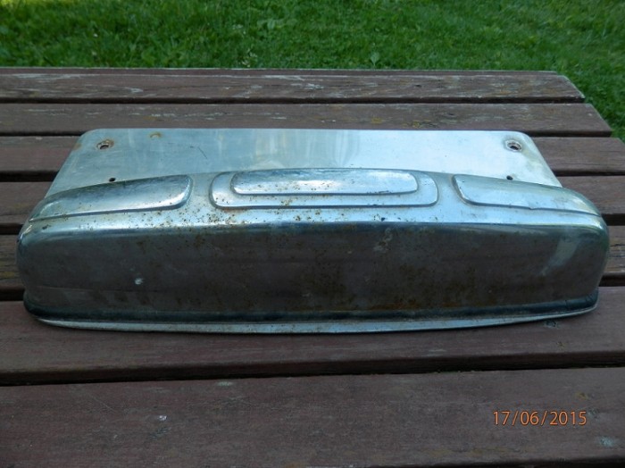 Mää väittäisin ton olevan jostain 1950-luvun alun jenkkiautosta. Neljä reikää ruuveille on jenkkikilpien kiinnitystapa.