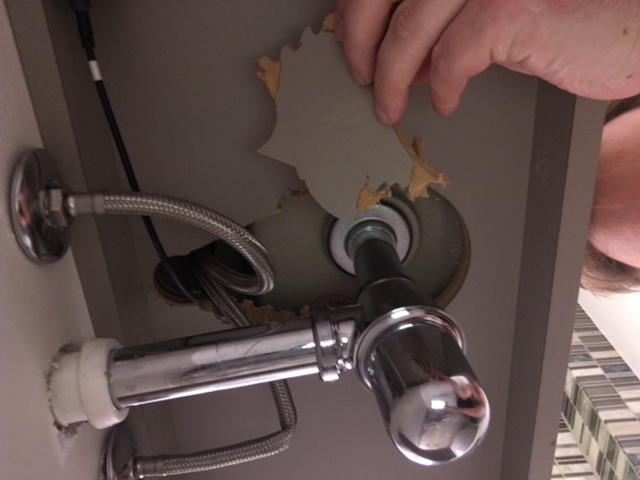 Kurkistus lavuaarin alle paljasti miksi nuo remonttimiehet olivat haluttomia tulemaan paikalle. Tiesivät, muistivat! Olivat perkele poranneet niin pienen reiän sinne lavuaarin alla olevaan levyyn, että sen kautta oli aivan mahdotonta edes vanhan sitikka-näpin livauttaa paikalleen sitä hanaa paikallaanpitävää u:n muotoista rautaa muttereineen. Hanan alla oli 12 cm tyhjää tilaa ja sitten tuollainen halkaisijaltaan 4 cm reikä. Tuon reiän kautta olisi pitänyt taiteilla se u-rauta sinne 12 cm päähän ja mutterit perään, ja nyt pitää huomata että rei'ässä on silloin myös nuo kaksi letkua ja sähköjohto haitolla!