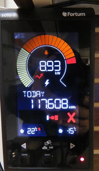 Tänään laitoin lattialämmityksen vesikierron termostaatin taakse käsisäädön sijaan, ja lisäksi siirryttiin sähkösaunaan, niin tuplaantui vuorokausilukema n. 120 kWh:n normaalin leudon talven 50-60 kWh:n sijaan. Taisi olla lattia termostaatin mielestä liian kylmä, kun rupesi sähköä haukkaamaan hiukan reilummin. Energiamittarin mukana tulee ylimääräinen lämpötilaanturi ja se on meillä sijoitettu toisen rakennuksen pakastimen sisään. Kätevä lisä kun pystyy mittarista näkemään pakastimen tilanteen.