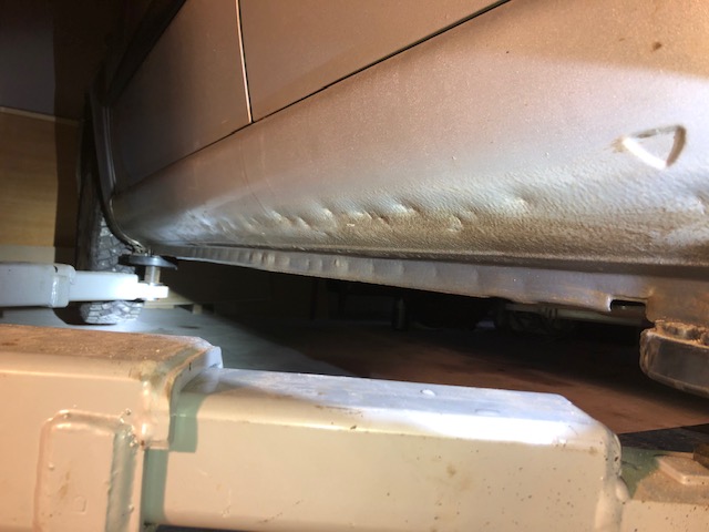 Varmaan muistatte miten varsin 70- ja 80-luvuilla katsastustapahtumat saattoivat olla arrogantteja ja ylimielisiä. Reikiä tehtiin pahimmillaan puoliväkisin. Kuvassa on nyt Järvenpääläistä osaamista C3:n kynnykseen. Takapäässä, pyöräkotelon lähellä oli pieni reikä jonka ympärillä oli jo heti hämmästyttävän tervettä ja paksua peltiä. Mutta, herra katsuri takoi vasaran terävällä päällä rajut kolhut metrin matkalle ihan selkeästi kovaan peltiin. Oikea menetelmähän on painella tylpällä raudalla kynnykseen. Minusta tämä on ollut tyrmistyttävä teko. Lisäksi keskimmäinen pönttö oli lävistetty kahdesta kohta puoliväkisin hyvin terävällä työkalulla. Reikien leikkauspinnoissa kiilsi teräs, ei ruoste.