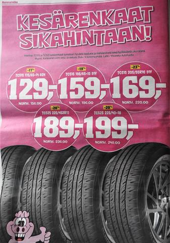 eskere kirjoitti: Renkaiden ei kuulu olla kalliimpia kuin auto. Eilen tuli just Kärkkäisen mainos, jossa oli sopivan hintaisia renkaita tarjolla. Josko sieltä taas.... siis jos ei hyvää käytettyä pakettia bongaa (=kesärenkaissa 5+ ja talvi 7+ mm pintaa) Emännän C4:ssa on ollut pari kesää nuo kärkkäisen kinukit. Eka kesä olivat hiljaiset ja muutenkin ok, mutta viime kesänä ilmeisesti kovettumisen johdosta äänekkäät ja syksyn kovemmilla sateilla aika liukkaatkin. Saa nähä tohtiiko noilla enää ajella, pintaa olisi kyllä vielä n. 4-5mm jälellä.