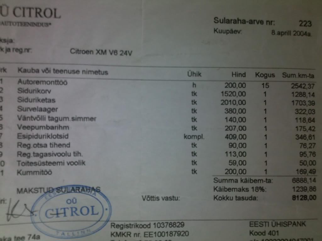 Muuten, noi remontit on tehty mun V6 24 valveen Tallinnassa jonkin edellisen omistajan toimesta. Noiden jälkeen ainoa isompi osan vaihto on ollut lämppärin kenno. Ainakin viimeisen vuoden aikana rakkine on toiminut käytännössä virheettömästi. Se vaan että jos ja kun vie vaikka Tallinnaan remonttiin niin jälkeen päin nuo reklamaatioiden teot on vähän hankalampia. Muuten, eiks toi Tallinnan putiikki ole joku merkkikorjaamo Citikalle ja Pökötille: http://www.parim.ee/?firma=5228&open=CITROL_OU