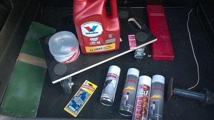 Tänää tuli käytyä Motonetist ostamas öljyt, suodatin, pohjamaalia, ruosteenestomaalia, pakkelia ja alustamassaa. Aloittelin töitäkin aloittamalla kuskinpuoleisen takoven hiomisen ja maalaamisen. Vaihdoin myös öljyt. :P