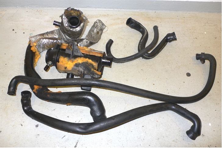 Ensimmäinen omistaja ottanut tosissaan kun hänelle oli kerrottu, että nuo huohottiment letkut tuppaa talvella jäätymään. Hän oli tehnyt perusteellista työtä näitä suojatakseen ja oli joka putken sekä huohottimen pöntön eristänyt liimaamalla näihin sentin paksuisen vaahtomuovin tapaisen eristeen ja ilmastointi teipillä suojannut vielä eristeen. Oli pirun työlästä saada irti tuo eriste ja esetonin kanssa hangata vielä liimatkin pois. Nyt putsattuna nuo ovat paikoillaan. Pakoputkestakin on purettu katin jälkeinen pätkä mikä oli jo kahdessa osassa. Tuon korjaaminen on huomisen työ, jos vaan suinkin aika riittää. Kuvassa huohottimen osat melkein putsattuna.