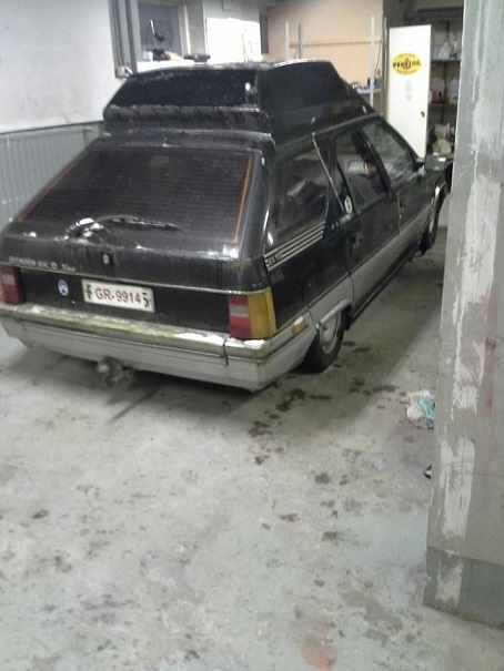 22.11 Varsin tunnettu vani vaihtoi omistajaa ja siirtyi talveksi tallille kunnostusta varten. Kyseisen ulkonäön vani sai edesmenneen Citroen aktiivin Markku Partisen ideasta tehdä jotain erilaista ja ideana toimi samantyylinen mustahopea cx. Maalauksen ja rakentamisen toteutti Automeca ketjusta lainaten viewtopic.php?f=12&t=1955918.11 kävin kokeilemassa lähtisikö vani tulille kahden vuoden seisonnan jälkeen. Jäähdytinnestettä puoli litraa syyläriin ja vanille virtaa. Toisella yrityksellä vani käynnistyi melko mahtavan savun saattelemana, savuverho tasaantui varsin nopeasti ja totesin että tämä elää Toivo heräsi että nousisiko tämä kenties lentokorkeuteen, hetken päästä keula pompahti ylös mutta samassa takapään pitkä putki rikkoutui. Lauantaina oli tarkoitus korjata rikkoutunut putki leikkaamalla pätkä putkea pois ja tekemällä klunssit päihin ja liittämällä ne välikappaleella yhteen. Alettuani hommiin totesin että toinenkin putki on puhki juuri samasta kohti jossa pitkät putket lähtevät nousemaan takakelkan päälle. Päätin ajaa auton 15km paineettomana tallille käsijarrun varassa. Vuorossa oli hanskojen tiskiinlyönti ja paineettomaan bx.ään talvirenkaiden vaihto joka oli mielenkiintoinen operaatio, täytyi hieman kaivaa pihaa peräkoukun kohdilta jotta sai ison hallitunkin alle ja vetokoukusta perä ilmaan. Renkaat kun oli ujutettu pois niin vuorossa oli sitten auton siirto. Parin kilometrin jälkeen takapönttö jäi matkalle, melu tosin pysyi varsin maltillisena. Matka tallille sujui hyvin, onneksi pojat olivat rakentaneet aikoinaan 8cm maavaralliselle soarerille rampin tallin kynnyksen yli,niinpä vani sai lainata ramppia. Kunnostus aloitetaan vaihtamalla takapäähän menevät hydrauliikkaputket, sitä seuraa pakoputkisto sekä jakopään hihna ja vesipumppu. Myös takapään jarrut vaatii remonttia ja uusia palikoita ja etupää herkistämistä. Matkalle todennäköisesti tulee paljon muutakin. Tavoite on sellainen että keväällä auto olisi katsastuskunnossa ja vani osallistuisi bx parque tapahtumaan Kainuussa keväällä.