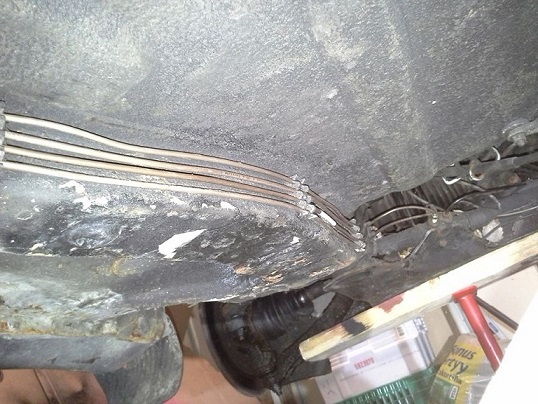 Olisi remontti aloitettu. Meni oma aikansa etsiessä taka-akselin kiinnityksiä, ne löydettyäni pudotin akselia niin paljon kuskin puolelta kun se putoaa ja laitoin tuen alle,näin sai kipeästi kaipaamaa tilaa jotta saa putket vietyä akselin ja korin välistä taakse. Pakoputkisto takaa tietysti pois tieltä,samalla paljastui että tarttee hommata myös poikittaispönttökin,takapönttö on jo uusi mutta näytti sen verran rapealta poikittainen että haenpa uuden ensi viikolla. Pari putkea sain tälle päivää vaihdettua,ensi viikolla loput. Kyllä se cu/ni putki on vaan niin loistavaa tuossa hommassa, kestää taivutusta ja varsin helppoa ujuttaa suoraa putkea ahtaisiin paikkoihin,sitten voi muotoilla tarvittavaan muotoon kiinnikkeille.