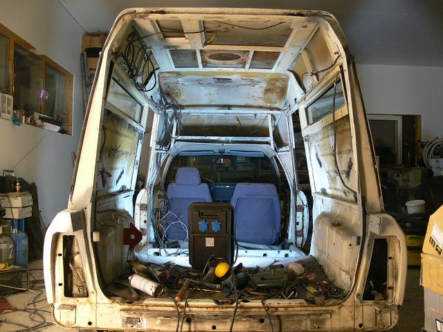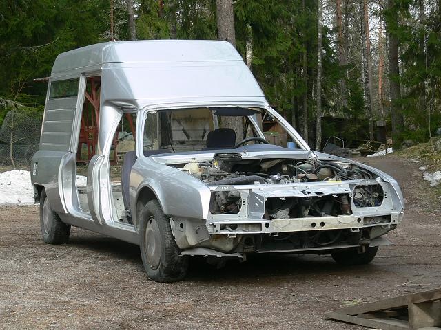 Talven pimeinä iltoina on saatu sen verran askarteltua tallissa, että ambulanssi on nyt maalattavana. Kuvassa vielä lasikuitutyöt ( takalokarien päät, katon läpivientien paikkaus ja kattoikkunan aukko) tekemättä. Takakylkiin tulee kaksi samanlaista ikkunaa, kuin näkyy kylkien yläosassa. Suosittelen lämpimästi Kuttilan kylässä sijaitsevaa autolasiliikettä, jonka nimeä en tässä mainitse. Palvelu oli nopeaa mutta edullista. Kontista on riisuttu kaikki ylimääräinen sisustus pois ja myös osa putkikehikosta, joka korvataan järeämmällä putkirakenteella. Paikattavaa löytyi kynnyskoteloista b-tolppien juuresta, missä on korin jatkoksen sauma. Jatkuu... Liitteet: