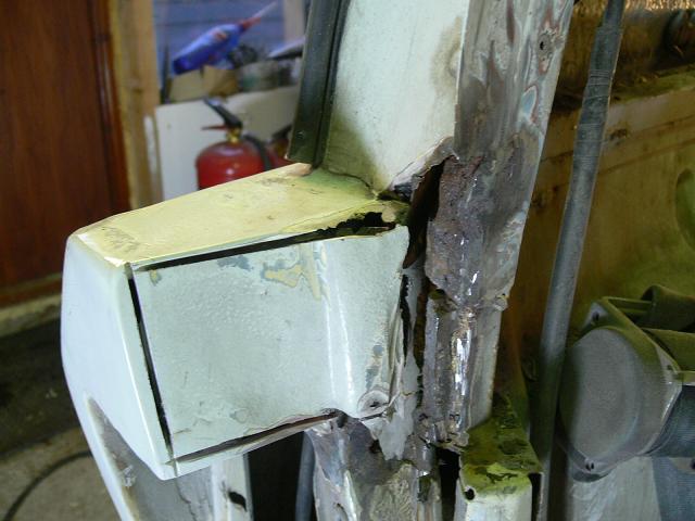 Toinen hitsattava paikka löytyi A-tolpan yläpäästä, josta piti poistaa pala kuttaperkaa väliaikaisesti hitsaustilan saamiseksi. Liitteet: