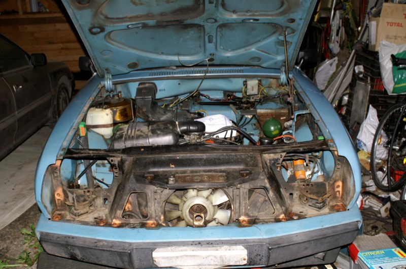 juu, niin minuakin ohjeistettiin, mutta ajattelin kokeilla ensin puskuri paikoillaan, kun näytti olevan niin huonossakunnossa alahiekkapelli ja varsinkin sen kinnikkeet, että olisi aiheutunut paaljon lisähommaa niiden irrottelussa... ja kyllähän sen noinkin saa tehtyä, pitää vain ensin ottaa se ropellin kehys löysälle, ja sitten ropellin kanssa yhtäaikaa ulos, sitten vasta kotelo irti
