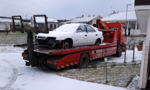 Itse käytin Kuusakosken palvelua, lähti parin päivän päästä pihasta, ajelivat tosin hinausautolla pitkin nurmikoita vaikka nosturinouto oli tilattu. https://elv.kuusakoski.com/tupas
