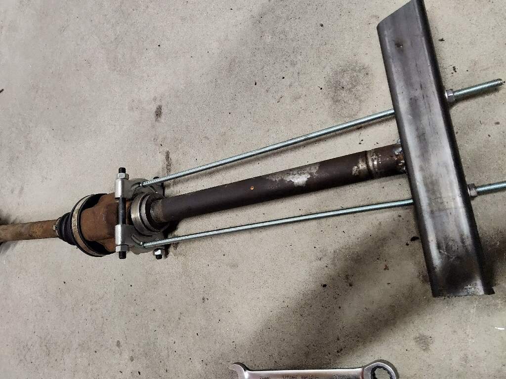 Sieltähän se tuli, mutta kyllä pisti vastaan. Prässi on pieni ja pöytämallia, niin se ei oikein sopinut tähän vetoakseliin. Piti improvisoida parempi ulosvetäjä. Normaali kiristyspää vaan kiemurteli akselin päässä niin hitsasin putkenpätkän tuollaiseen palkkiin, jotta koko paketti pysyy akselin kanssa linjassa kiristyksen aikana. Sit kiristystä, lämmitystä, kiristystä, lämmitystä, kunnes lopulta naksahti millin ulospäin ja sitten irrotusöljyä mukaan... Liitteet: