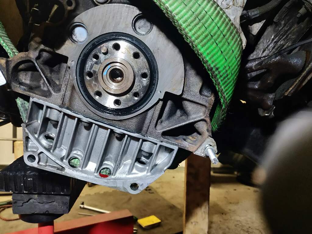 Tuossa se laatikko nyt taas on autossa takaisin! Mutta eipä tämä(kään) tarina vielä lopu. Kun ruuvailin loput tarvittavat pultit ja kannakkeet ja yhdistelmä roikkui taas autossa kiinni, kokeilin vielä pyörittää konetta varmistaakseni, ettei lootasta kuulu mitään ylimääräisiä ääniä tai mikään ei hankaa. No, vähän hankalaa kokeilla, kun kone ei pyörinyt ollenkaan! Mietin, että mikä ihmettä, onko sinne väliin tippunut jotain tms. Turbiini pyöri ihan hyvin vielä asentaessa ja moottori samoin, kun hain vetolevyn pultinreikää oikeaan paikkaan. Moottorin ja lootan kiinnityspultitkin menivät helpolla kiinni, pääosin käsin pyöritellen, mutta pakkohan tuossa oli hakea vielä tunkki ja norsu takaisin, irrotella kiinnitykset ja vetää vaihdelaatikko hiukan irti, että pääsee katsomaan. Ei mitään ihmeellistä, lattialle ei tippunut mitään pultteja tai työkaluja. Nyt kummatkin pyörivät, kuten ennen asennusta - mitä nyt vähän laahasivat keskenään, kun laatikko roikkui hieman vinossa ketjun varassa. Tsekkasin myös endoskoopilla, ettei turbiinikotelossa tai turbiinin ja vetolevyn välissä näkynyt mitään ylimääräistä. Päätin laittaa puoliskot taas yhteen ja tarkistaa säännöllisesti, että milloin kampiakseli lakkaa liikkumasta vapaasti. Taas kerran laatikko osui hyvin yhteen moottorin kanssa, ja pultteja sai kiristellä pääosin sormin. Kampiakseli pyöri joka pultin ja kiristyskierroksen jälkeen, kunnes yhdistelmä oli naitettu yhteen ja.. eikös se perkule nyt sitten liikkunutkin normaalisti, vaikka loota oli jo kiristetty moottoriin! Otin ohjurina käyttämäni pinnapultin irti ja laitoin vetolevyn ja turbiinin pultit yksi kerrallaan kiinni sormitiukkuuteen ja siinäpä se kampi tulikin pyöräytettyä ympäri koko kierroksen. Kaikki pelasi yhteen juuri kuten paria tuntia aiemmin olisi alkujaankin pitänyt. Mikä perkule siellä on voinut olla pinteessä? Turbiinissa on kohoumat pultinreikien välissä ja vetolevyssä taas pultinreiät ovat pienten kohoumien kohdalla, eli ne sopivat yhteen, kun pultinreiät ovat about kohdallaan. Ja ohjuri tuli läpi eli kohoumat eivät voineet olla vastakkain. Turbiinissa on keskitystappi, joka keskittää sen kampiakseliin. Tappi on useamman sentin mittainen eikä laatikkoa saa koneeseen kiinni, jos tappi ei ole keskellä kampiakselin puolella olevaa koloa. Ensimmäisellä asennuskerralla ei myöskään tuntunut erityisempää vastusta pulteissa, ja olisin huomannut, jos laatikon viimeiset millit olisi pitänyt jotenkin väkisin kiristää kiinni moottoriin. Niih, ja vetolevyn ja turbiinin pultitkaan eivät voi jäädä pinteeseen, kun pultti menee vetolevyn reiästä läpi turbiinin kierteisiin ja lähinnä vaan puristaa ne yhteen. Nythän on tietysti hyvä, kun toimii, mutta voisin olla huolissani, että onko jotain rikki, jos vaan tietäisin, miksi kampuraa ei saanut liikutettua. Jos vetolevyyn tai turbiiniin on kohdistunut jokin pinne, niin se ei ole voinut olla kovin suuri taipuma. Tuota olisi ehkä kuitenkin hyvä testata ennen käynnistämistä. Jos ruiskusuuttimien johdot irroittaa, niin eikös se estä konetta käynnistymästä? Tuossa on vielä nappistartti, niin ei voi avaimella pyöräyttää konetta vain hiukan eli startti pyörittää sitten konetta useamman sekunnin kerralla.