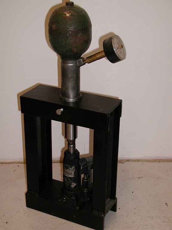 Tässä hieman yksinkertaisempi versio. Tukevasta raudasta kehikko. Ylärautaan jousisylinterin vaatima reikä ja mäntään tangonpätkä sisälle josta sitä voi pullotunkilla nostaa. Hydrauliputken reikään tuli messingistä sorvailtua muunnosnippeli painemittarin kiinnitystä varten. Tunkki alle, mäntä alas, sylinteriin oikean väristä nestettä ja pallo paikalleen. Jos kaikki menee kohdilleen saa useammankin pallon testattua ilman sotkua ja nesteen lisäystä.