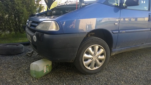 Oltiin taas niin automiestä. Jäähdyttäjän letku liian pitkä. Vuoto kasvoi pikku hiljaa, luulin kansipahvin menneen. Xantian syylarilla ei ollut oikein tilaa, letku kuumeni ja alkoi hangata vetoakseliin. Varaosaxantia sai luovuttaa toisen letkun. Taas mennään.