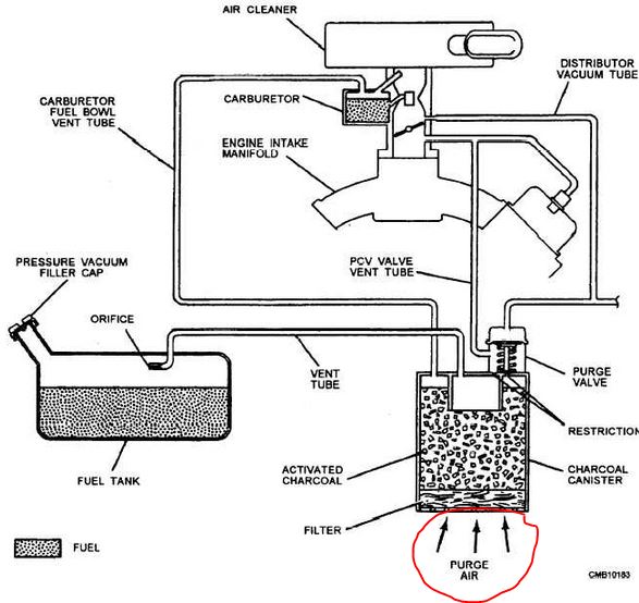 Elikkäs, ymmärtäisin että jos tuo pöntön alla oleva putki on jää/mutapalikan sisällä niin mm kun tulee tilanne että tankissa paine alkaa kasvaa lämpötilan noustessa, esim kun ajaa pakkasesta talliin niin tämä hiilitankki juurikin suodattaa ylimääräisen ilman hiilen läpi ulkoilmaan niin että bensahöyrät jäävät hiileen. Toisin päin homma toimii niin että kun autolla ajetaan niin tankkiin pitää tulla korvausilmaa polttoainee vajetessa ja käsittääkseni se korvausilma ei tule kuin tuon purkin alla olevasta letkusta. Sama asia esitetään tuossa oheisessa kaaviokuvassa kohdassa purge air pöntön alla.