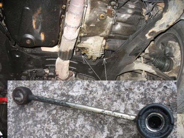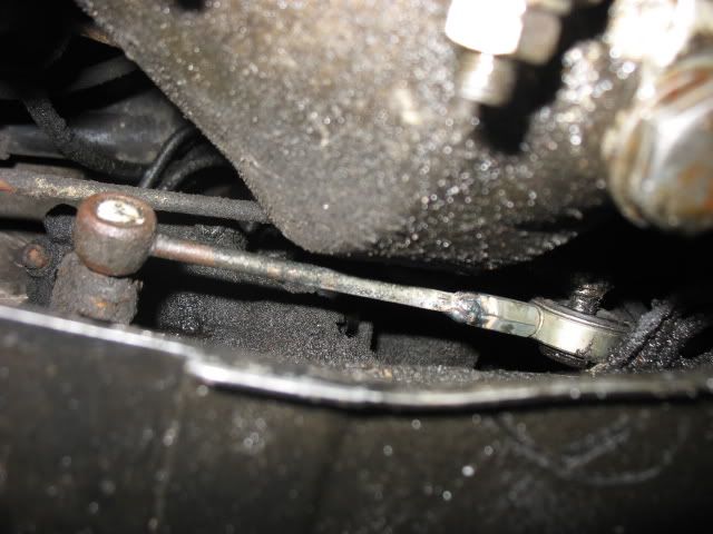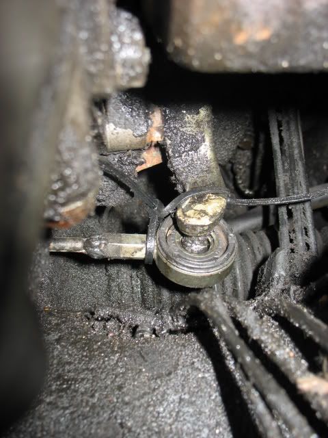 Vaihdetangon päästä lähtee peltitanko jonka päästä kaksi ohutta tankoa ja näiden päässä on ne ns nupit jotka painetaan vaihteistossa olevan hänksättimen teräspalloihin. Toinen oli irti ja ihmekös tuo kun sisällä on öljystä nyljääntyvää kumia. Tangon sai takaisin vain ryömien selällään edestä käsin taaksepäin. Liitos palautui vain piiiitkää meisseliä käyttäen sillä käsi sinne ei mahdu. Varmistin liitosta kuparilangalla ja siihen oli pakko valmiiksi tehdä silmukka joka sitten pakotettiin piiiikällä meisselillä paikoilleen.