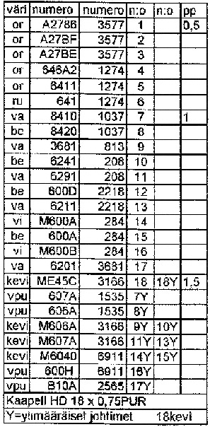 Homma aloitettu. Muovisuoja lähti vain repimällä, tiukassa liimaukset. Katkaisin koko nipun jalkatilasta ja vedin satsin ovesta ulos. Haitarista ensin teippaukset pois. Ovinippu myös irtaalleen. On 18 x 0,75 robottikaapelia, vaippa poistettuna, lisäksi kiersin 10 säiettä lisää (mm. vahvistukset 1,5mm2 ikkunajohtimille), "hukkapätkästä". Meni liukkaasti haitariin. Aloinkin jo juottelun kutistesukkineen oven puolelta. Se kun on tehty, nykäistään liiat löysät kajuutan puolelle..... Aloitin juottelun ohuimmista, peilijohdoista, niihin uuden kaapelin alkupään numerot. Kun tulee paksumpien johtojen vuoro, niihin tuplat, löytyykin samoja numeroita lisäjohtimista, ne kun on otettu hukkapätkän päälikerroksesta. Alkuperäisjohtimissa on yksilönumero ja kohdenumero?. Teinkin taulukon johon merkkaan päisin menevät johdinnumerot, helpottaa.