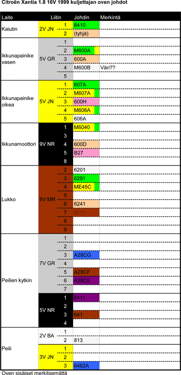 Homma paketissa - ei Xanttu paalaamossa Pelkääjän takaovessa oli 9:stä johdosta vain pari ehjää. Kaapelien vaihto takaoveen on kuitenkin siisti etuoveen verrattuna. Keskipilarin muoviverhous irti. Turvavyön rulla pois tieltä. Kannattaa lukita rulla ettei turvavyö kääriydy kokonaan sisään. Ovesta vain kaiutin pois. Johtonippu poikki sisäpuolella. Johtonippu vedetään kaiutinaukosta näkösälle. Kaapelien lyhennys ja jatkoksi tilalle silikonikuorista monisäiejohdinta. Silikonijohdon päähään juotetaan numeromerkkijohdot vanhoista kaapeleista ja uitetaan johtonippu haitarin läpi takaisin sisälle. Napsaistaan numerojohto pois silikonijohdon kohdalta ja silikonijohto juotetaan yksi kerrallaan alkuperäiseen vastaavaan johdonpäähän. Juotokset suojataan kutistemuovilla. Kyllä tämä ainoa Xantian pikkuvika olisi pitänyt hoitaa jo vuosia sitten