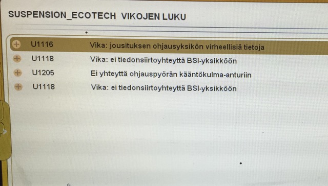Koska palstalla on ollut paljon keskustelua C6 ylläpidon ihanuudesta ja kurjuudesta, tässä äskeisen öljynvaihtohuollon yhteydessä luetut jousituksen vikakoodit arvon tietäjien kommentteja varten :) Mistähän mahtaa olla kyse? Aikaisemmin ei vastaavia herjoja ole näkynyt, nämä ei myöskään kuittaantuneet pois. Auto on allekirjoituksen 2,7 muistisäätöisellä ratilla eli sen pikkupäivityksen jälkeistä mallia.