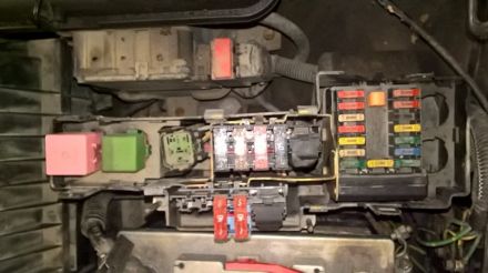 matkustamon rasiassa sulakkeet 3 rivissä, rasian alla näkyy joitain releitä