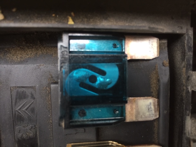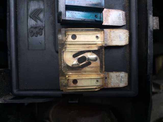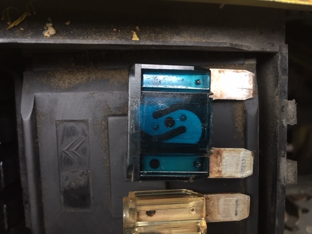 7.) Vielä kerran moottoritilan pikkusulakkeet yksi kerrallaan irti ja päivänvalossa tarkastaen, ovatko ehjiä. Kaikki olivat OK, ei sulamisia eikä tummumisia. Samoin sulakerasian liittimet sulakkeiden alla eivät olleet mustuneet tms. WD olinkin jo laittanut taannoin liittimiin just in case.