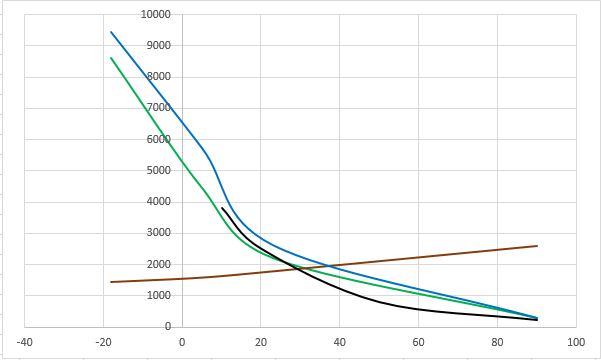 Siinä onkin jo niin monta pistettä, että voi varmaankin kohtalaisen arvion pienempiinkin lämpöihin saada ekstrapoloimalla .