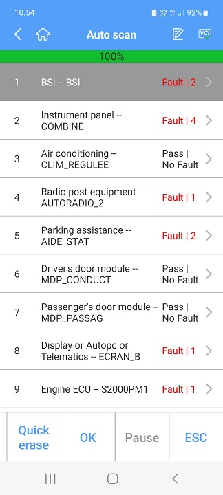 Tämä sitten tarkoittaa että testeri osaa kommunikoida BSI:n ja moottoriohjauksen kanssa. Kaksi vikakoodeja BSI:ssä ja yksi moottorin ECU:ssa. Nyt sinun pitää vaan painaa sitä "fault x" tekstin oikealla puolella, ruudun reunalla, näkyvää nuolta ( > ), niin pääset eteenpäin.