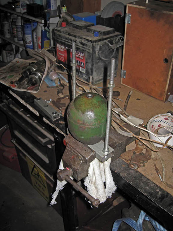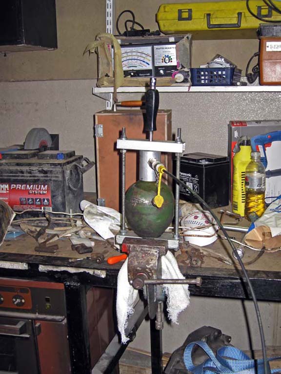 Laitetaanpa viimein tännekin näytille kesällä kuvattuja kuvia venttiilittömien jousipallojen paineistuksesta. Aloitetaan homma asentamalla suojalasit ja kuulonsuojaimet. Kierretään pallosta tulppa pois. Onnistuu esimerkiksi laittamalla pallo tulppa alaspäin ruuvipenkkiin, kiristämällä tulpan ympäriltä ja pyörittämällä palloa putkitongilla aukipäin. Kun enimmät typet tössähtävät pihalle, voi loput pyörittää käsin. Tämän jälkeen otetaan yksi pallon korkki, johon on porattu kolo (ei läpireikää) Torx-palalle. Liitteet: