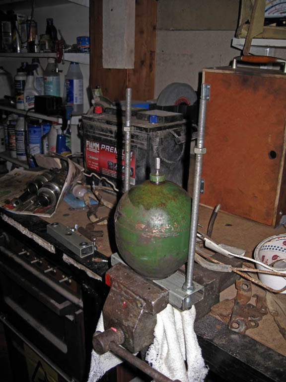 Sen verran valotetaan apparaatin detaljeja että tuo paineenalaisen tulpan kiinni ruuvaaminen on se ongelma eli mistä välistä väännin tiivistyy. Ensimmäisessä versiossa tiivistys oli tuon meisselikahvan varresta mutta sen ongelmana oli että kahva poistui maapallon säteen suuntaan kun pullon venttiiliä raotti. Nykyisellään tiivistys on palanpitimen ja tuon alumiinimöykyn välissä ja palanpitimessä ollut läpireikä on tukittu Mystic Puddingin Comical Metalilla.