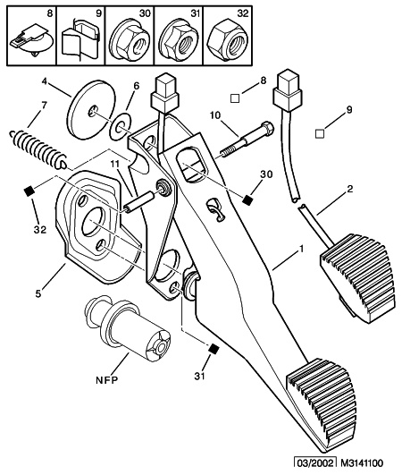 Mitenhän tuon jarrupolkimessa olevan tapin saisi irti. Siis se pitkulainen osa joka on polkimen ja itse venttiilin välissä. Kuvassa merkinnällä NFP. Pitäisi saada pois edestä, kun irrottaisin jarruvalokatkaisijan tarkistelua varten. Mutta johto on sen ja polkimen rungon välissä niin ettei liitin sovi tulemaan välistä pois. Ei viitsisi avata tuota kosketinosaa tuolla lattianrajassa ryömiessään.