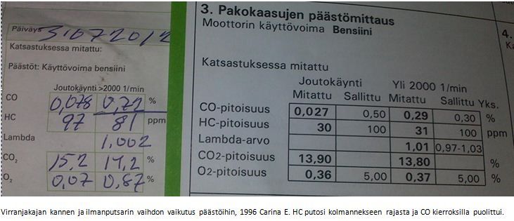 Lisäksi testasin kaverin -96 mallin Carinaan tätä jossa oli päästöongelma mutta vain kierrosten ollessa korkealla (tyhmäkäynti oli vain jotain 0.06%) mutta kierroksilla oli 0.7% (raja kierroksilla on 0.3%)