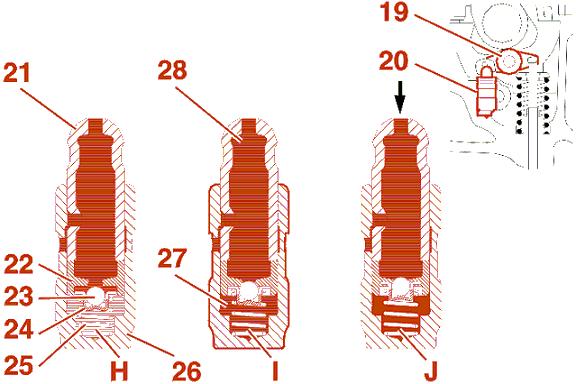 black_van kirjoitti: Asentaja epäilee että venttiilinnostimet ovat kuluneet,jolloin pääsevät valuttamaan öljyn pois ja siitä tuo ilmiö. Voivat olla väljätkin, mutta muissakin ketjuissa mainitut pesuaineet ovat joskus auttaneet. Forte etenkin. Jotkut nostajat (tai tässä tapauksessa oikeastaan välyksen poistajat) saa myös purettua ja puhdistettua. Rakenne näkyy tuossa kuvassa. Vikana on usein tuo alakammion tiivistävän kuulan likaantuminen ja vuotaminen, jolloin moottorin ollessa sammutettuna avoimen venttiilin jousi painaa nostinta kasaan ja alakammion öljy pääsee vuotamaan pois. Käynnistymisen jälkeen kestää hetken ennenkuin öljy taas täyttää kammion. Ongelma pesun suhteen on se, että öljy ei juurikaan kierrä noissa nostimissa. Pesuainetta päätyy kyllä hieman noihin nostimiin, mutta vaikuttaa aika hitaasti. Jos työn teettää korjaamolla, kannattaa vaihdattaa uudet (30-40e /kpl). Ajan kanssa itse tehden puhdistamistakin voi yrittää.