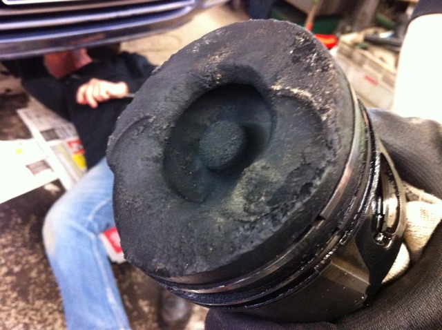 Ongelma: Paha savutus kylmäkäynnistyksessä, ruma venttiliääni. Diagnoosi: vuotava ruiskusuutin, virheellinen palotapahtuma ja sen seurauksena viottunut pakoventtiili, lohkeama männässä, särkynyt kampiakselin laakeri ja vääntynyt kampiakseli, sylinterin seinämässä syvä ura. Millä logiikalla virheellinen palotapahtuma särkee kampiakselin laakerin ja vääntää kampiakselin mutkalle? Tunnustan, etten ole etenkään uudempien moottoreiden asiantuntija. En vaan ymmärrä syy-seuraus-suhdetta.