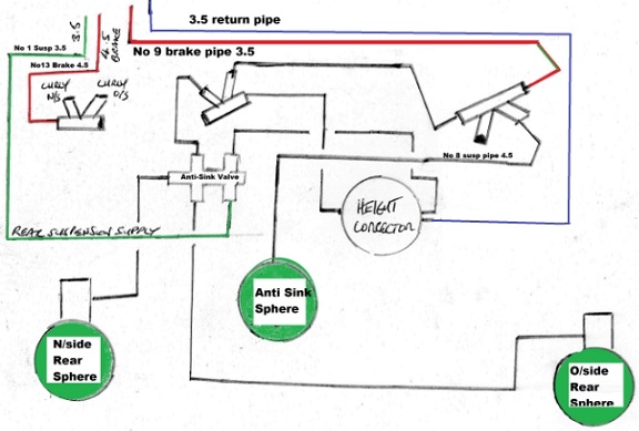 Niin tai siis tuo edellisessä mainitsemani jarruputki on tietysti numero 2 eikä ysi. Sen irroittamiseen alustavasti perehtyessäni törmäsin yllättäen (!!!) umpiruosteiseen kolmihaaraan putkineen. Tuossa valokuvassa siis tuo numero 2 on putki, joka sukeltaa tuon spiraalin vierestä taka-apurungon päälle. Tässähän vois tietysti käyttää samaa metodia kuin safetyvalven kanssa oli pakko eli katkoa kaikki lähtevät putket, mutta koska yksi tuosta kolmihaarasta lähtee kuljettajanpuoleisen takarenkaan lähellä olevaan yhtä rapeaan kolmihaaraan, niin sitten taas pitäis katkoa siitäkin lähtevät, jonka jälkeen noita turhaan vaihdettavia oliskin jo aika monta, kuten piirroskuvasta ilmenee (jossa siis tuo jarruputki numeroitu virheellisesti numerolla 9) :evil: