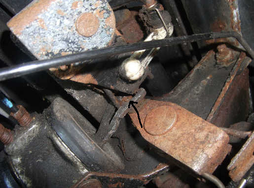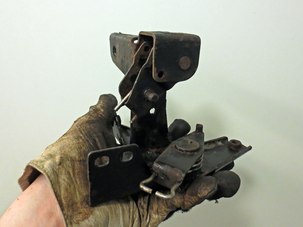 Kuva ei ole minun autosta, vaikka kyllä se samannäköinen onkin. Manuaalisäädön vipu ei vartin nitkuttelunkaan jälkeen kulje kunnolla. Automaattisäädön vipu on ok. Aikani funtsittua totesin, että homman voinee hätäkorjata ihan läpipultilla. Kyseinen tappi muodostaa vain saranan, jossa ei tarvitse olla liikevaraa karan liikesuunnassa. Kyse ei siis ole tuosta linnunluun kuulasta vaan manuaalisäädön (pystyssä oleva vipu) päässä olevasta tapista, joka menee karassa olevaan reikään. Sen molemmin puolin on automaattisäädön kaksipäinen jousi. Kuvalinkissä keskellä kuvaa. Hätäkorjauksen tarve johtuu uhkaavasti lähestyvästä katsastuksesta. Vivusto on niin huonossa hapessa, että se tarvitsee uusimista.