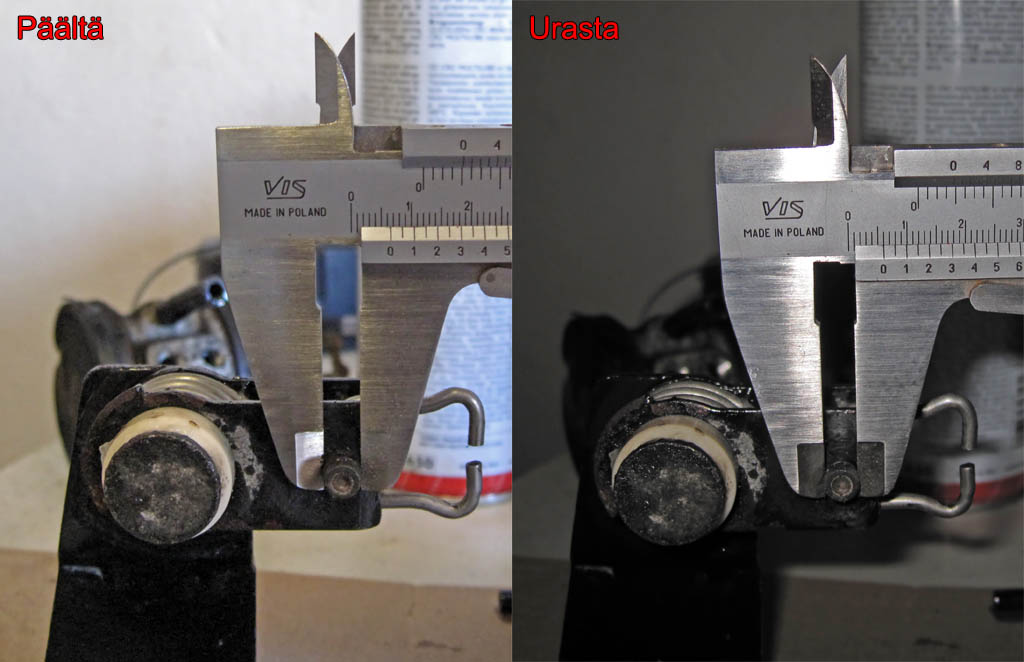 Viikonloppuna vihdoin kävi niin, että me kaikki - siis minä, työntömitta, korkeudensäädin ja muistini - olimme samassa paikassa samaan aikaan. En tiedä, kuuluuko keskellä rullaa olla ura vai oliko se vaan kulunut siihen, mutta ohessa mittaustuloksia. Ja sehän on tosiaan rulla, eikä tappi - eli pyörii siinä. Mitattu kohde oli etuvivustosta, mutta samanlainenhan tuo kyseinen osa on takavivustossakin.