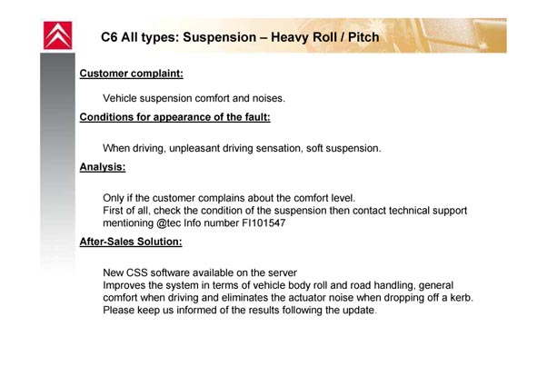 C6 omistajille tiedoksi, jousitukseen saa merkkihuollossa teetettyä päivityksen jolla saa (ainakin itseäni) häirinneen heijaamisen rauhoitettua. Myös etupään ulosjoustoissa ja terävissä kuopissa ainakin omasta autostani kuulunut lievä paukahtelu loppui. Tuo heijaaminen oli lähinnä peräpään liiallista ylös-alas huojahtelua loivissa ja toistuvissa tienpinnan heitoissa. Päivityksen ohjelmaversio on tunnukseltaan 71.0E/96.651.292.80 ja se tehtiin ohjelmaversion 68.70/96.627.952.80 päälle. Hintaa toimenpiteelle tuli noin 60,- ja kannatti tehdä 8-)