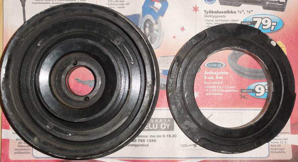 kaselin kirjoitti: Joo ei oo väärennös vaan on vaihtoehto/korjaus/korvausosa toinen esimerkki kaksoismassa vauhtipyörän tilalle kiinteä limppu koska massat ei kestä huonona puolena värinät lisääntyy sama kuin hihnapyörällä. No tuonkin voi tehdä monella tapaa, mutta esim kaksi semmoista pilipali-firmaa kuin LuK ja Valeo tekevät aftermarket-pakettina kaksoismassavauhtipyörällisen kytkimen korvaavia ns four-piece-kittejä, jossa on kiinteä vauhtipyörä, ja jousto kytkimen puolella. Se väärä tapa on ottaa kiinteä vahtipyörä esim bensaversiosta ja laittaa sen jatkeeksi kmvp-paketin kytkin. olli__o kirjoitti: Eikös tuossa ole tosiaan muotoiltu kolme uraa reunaan ja "stoppari tapit", mutta kumpikin on tehty samaan pellinpalaan, eli eivät tosiaankaan liiku, eli otettu mallia tuosta:  Kyllä menee huijauksen puolelle, kannattaa valistaa myyjää/tukkuria, todennäköisesti sitäkin on kaukomaiden valmistaja huijannut. Juuri niin! Onhan se hyvä varoittaa täälläkin moisesta, mutta sitäkin tärkeämpää olisi reklamoida sinne, josta huono tuote leviää, eli myyjän kautta maahantuojalle. Näin moista kuraa ei tulisi enempää, eikä niillekään jotka ei tätä lue. Plus samalla saa omat kulunsa takaisin. Jotenkin nykymaailmassa vaan on tapana ennemmin uutisoida netissä mahdollisimman rajusti seiskan ja iltapäivälehtien tyylisesti, saakohaan sillä sitten hyvän mielen vai miksi.