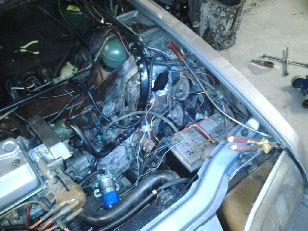 Konehuonetta kun kehuttiin niin tässä huono kuva johdotuksista. Ilmeisesti on joskus kärähtänyt moottorin johtosarjat tms. Voihan se toki olla myös tekniikanvaihdos. isot sähköliittimet ovat omiaan korin puolelta ja oikean värisillä johdoilla mutta niistä koneeseenpäin on vain mustia johtoja ja irtoliittimiä.