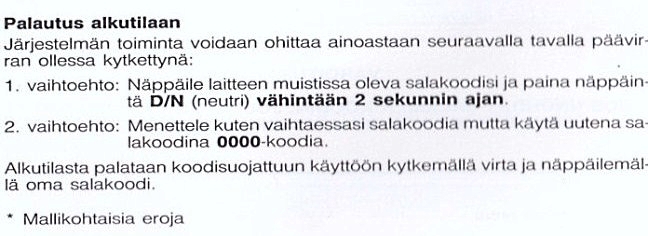 Molemmat salakoodit (vanha ja uusi) ovat voimassa, kunnes jompaa kumpaa käytetään autoa käynnistettäessä.