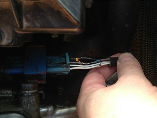 Sitten ei kun megaohmin vastus samalla tekniikalla kiinni samasta reiästä kuin konkka, harmaaseen piuhaan, ja niiden jalat kääritään yhteen. Harmaa piuha poikki siten, että kytkennät jäävät sinne ECU:n puolelle sitä piuhaa. Sitten kuoraistaan taskuveitsellä se harmaan piuhan lambdan puoleinen pää, ja kierretään yhteen vastuksen vapaa jalka ja toi piuhan pää: Liitteet: