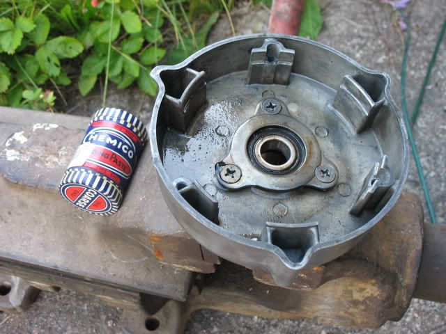 Kuvassa on Gdansk-tyyppiseen ruuvipenkkiin (40 kg) kiinnitetty 30-vuotiaan prätkän laturin kansi. Ruuvit eivät auenneet ruuvarilla ja sen tyveen asetetulla avaimella jolla momenttia tehostetaan, tiedättehän sen ruuvarin 8 mm kannan siellä kahvan tyvessä. Seuraavassa kuvassa näkyy töhnää ruuvikannoissa ja ruuvit ovat auenneet parin minuutin ähellyksellä. Tanhapurkki näkyy ruuvipenkin vasemmassa päässä, mene ja osta mutta älä hio venttiileitä, käy paremmin avaushommiin. Venttiilit hoitaan Miralla osaavalla pajalla...