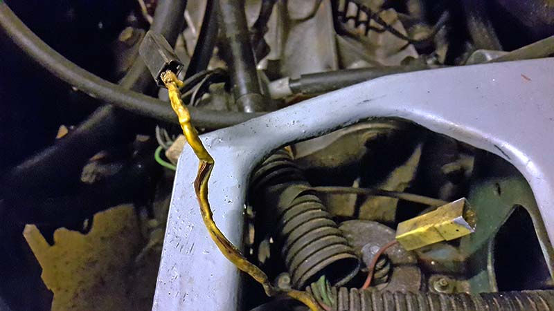 Ilmeisesti johdosta on jossain vaiheessa elämäänsä kulkenut enemmän virtaa kuin tehtaan sähköinsinööri on ajatellut, joten suojakuori on sulanut kauttaaltaan niiltä osin mitä sitä moottoritilassa on mahdollista nähdä. Johto vaikuttaisi menevän rintapellin kumiläpiviennistä auton sisään, mutta auton sisäpuolelta tarkasteltuna yksikään sisääntuleva keltainen piuha ei näytä kärsineeltä?
